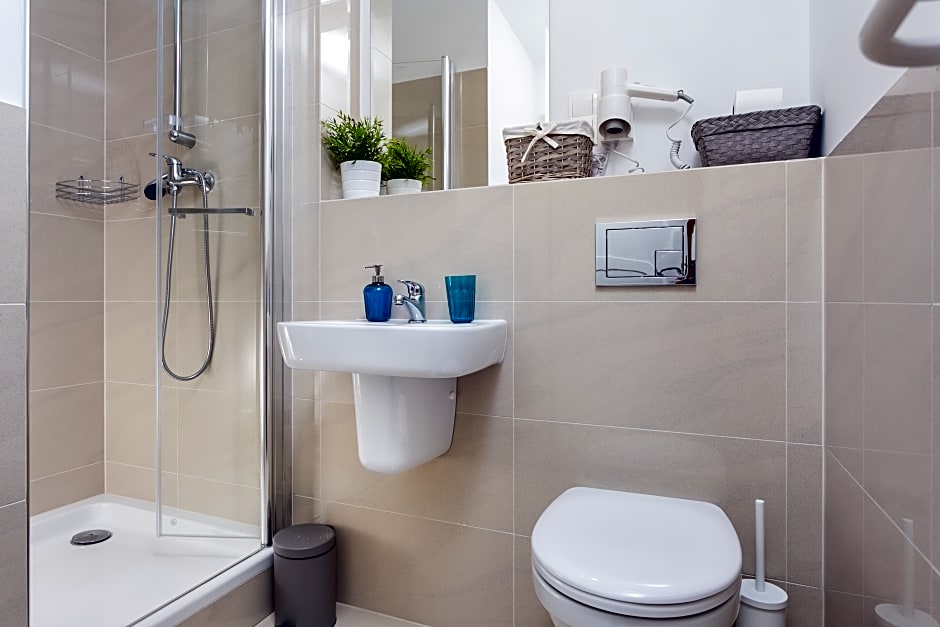 This apartment is a tastefully decorated interior that surprises with its spacious layout, offering comfort for up to four guests. The bedroom is a separate room, furnished with a double bed. The apartment includes a living room with a double fold-out sofa, a kitchenette with a dining table, and a bathroom with a shower. The apartment features windows facing inner part of the courtyard, ensuring a peaceful atmosphere. Designed with the highest quality comfort in mind, this apartment is perfect for families, couples, or groups traveling together, as well as for business stays. It is also a great alternative to renting an apartment for longer stays. With a size of approximately 180 ft², this two-room suite is ideal for those who need separate sleeping areas or simply enjoy extra space.